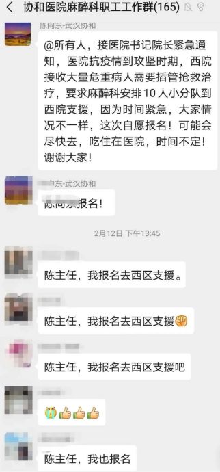 “緊急通知!醫院抗疫情到攻堅時期,西院接收大量危重病人需要插管搶救治療,要求麻醉科安排10人小分隊到西院支援。時間緊急,大家自愿報名”。這是2月12日上午陳向東在工作群里發出的醫院緊急通知。