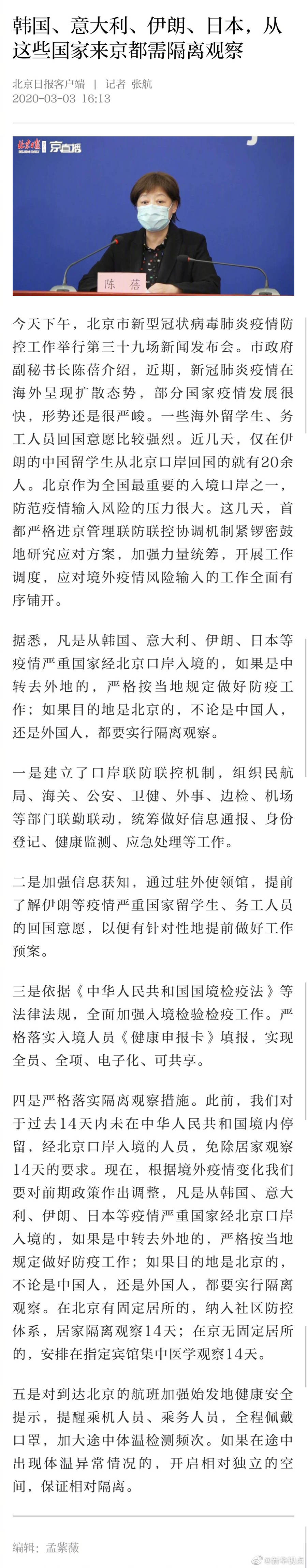 今天下午,北京市新型冠狀病毒肺炎疫情防控工作舉行第三十九場新聞發布會。市政府副秘書長陳蓓介紹,凡是從韓國、意大利、伊朗、日本等疫情嚴重國家經北京口岸入境的,如果是中轉去外地的,嚴格按當地規定做好防疫工作;如果目的地是北京的,不論是中國人,還是外國人,都要實行隔離觀察。