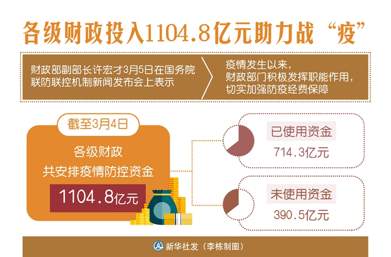 新華社北京3月5日電(記者申鋮、劉紅霞)財政部副部長許宏才5日在國務院聯防聯控機制新聞發布會上表示,疫情發生以來,財政部門積極發揮職能作用,切實加強防疫經費保障,截至3月4日,各級財政共安排疫情防控資金1104.8億元。