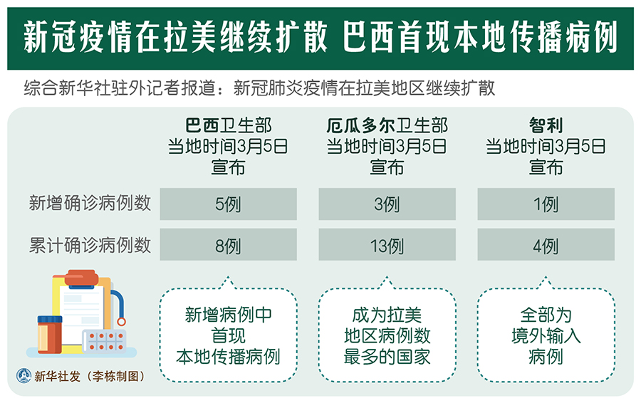 新華社墨西哥城3月5日電? 綜合新華社駐外記者報道:新冠肺炎疫情在拉美地區(qū)繼續(xù)擴散。巴西政府5日宣布該國首現本地傳播病例,厄瓜多爾、智利和阿根廷確診病例數量也在增加。拉美多國紛紛提升防控力度,加強應對措施。