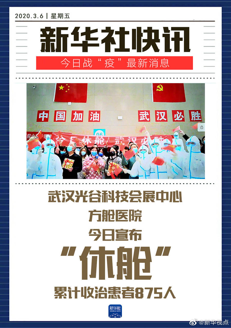 3月6日,武漢光谷科技會展中心方艙醫院宣布“休艙”。2月17日,該方艙醫院正式開始收治患者,累計收治患者875人。