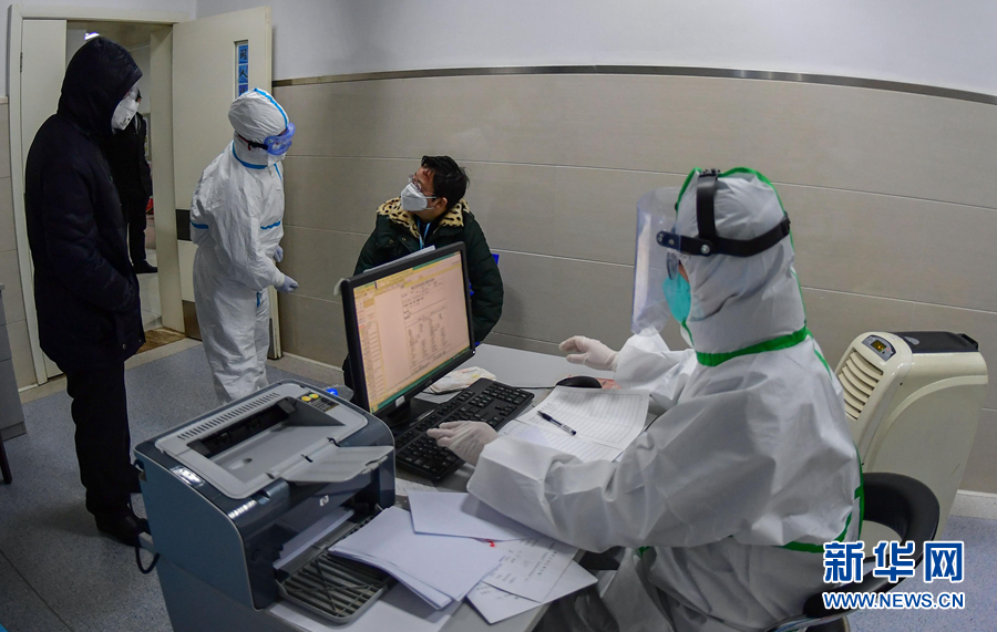 2月1日,在湖北省榮軍醫院發熱門診,醫生王琴(右一)和護士劉蕭(左二)接診發熱患者。 新華社發(劉中燦 攝)