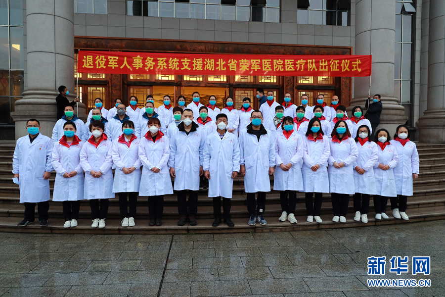 2月11日,退役軍人事務部組建首支醫療隊馳援湖北省榮軍醫院。這是出征儀式現場。新華社發(曹舒昊 攝)