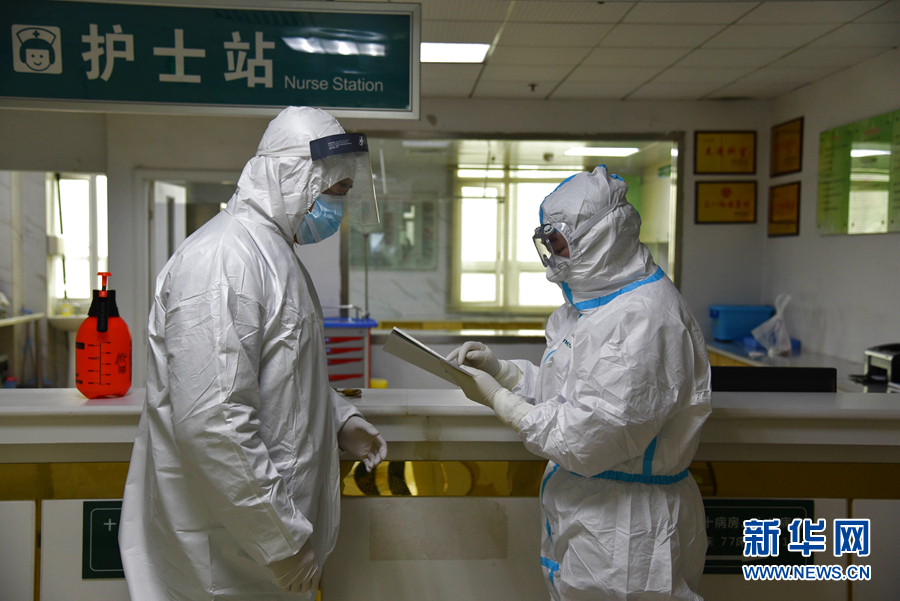 2月13日,湖北省榮軍醫院黃海明醫生(左)與退役軍人事務系統援助湖北醫療隊隊員、江西省榮軍醫院醫生、退役軍人晏鑫鵬做工作交接。 新華社發(朱玲玲 攝)