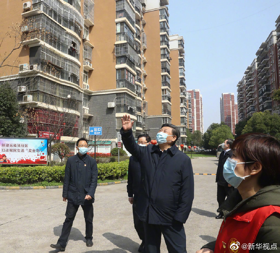 正在武漢考察的習近平總書記來到東湖新城社區(qū),察看社區(qū)衛(wèi)生防疫、社區(qū)服務、群眾生活保障等情況。樓上居家隔離的居民群眾看到總書記來了,紛紛從陽臺和窗戶探出頭來,揮手向總書記問好,有的搖著國旗高呼:“中國加油!武漢加油!”習近平不時駐足,微笑著向大家揮手致意:“大家一起加油,再堅持一下!”(文字:張曉松、朱基釵 攝影:鞠鵬,謝環(huán)馳)