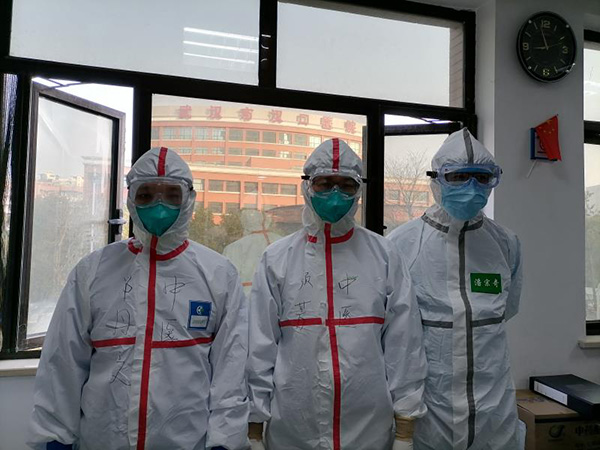 廣東省中醫(yī)院援助武漢漢口醫(yī)院的中醫(yī)小分隊成員鄭丹文(左)、顏芳(中)潘宗奇(右)。