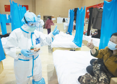 醫(yī)護(hù)人員在照護(hù)患者身體疾病的同時(shí),注意做好心理安撫工作。圖為在武漢江夏方艙醫(yī)院,湖南中醫(yī)藥大學(xué)第一附屬醫(yī)院護(hù)士長涂麗(前左)與一名患者交流。