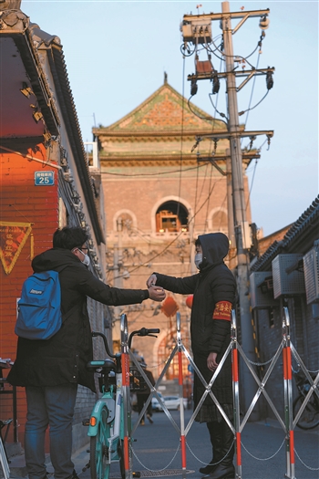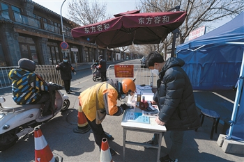 “我們從大年三十就開始排班了。我是從正月初三開始進(jìn)社區(qū)做入戶排查,現(xiàn)在和另外兩名志愿者一起負(fù)責(zé)這個(gè)路口,從早上九點(diǎn)到晚上九點(diǎn)不間斷。”來(lái)自前門街道辦事處政務(wù)服務(wù)中心的周偉介紹說(shuō)。