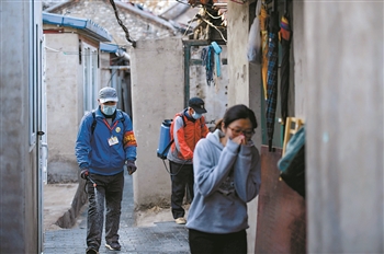 3月12日,任國(guó)慶(圖左)和搭檔來(lái)到前門大江社區(qū)一院落噴灑消毒液。