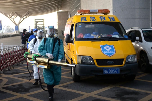 2月5日,長沙藍天救援隊隊員準備進入長沙磁浮高鐵站消毒殺菌。新華社發(陳振海攝)