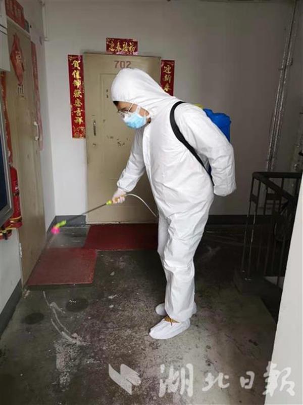 消殺完兩個樓棟,一桶30公斤的消毒液差不多見底了。胡俊昊已是滿頭大汗,防護服也不知何時破損了。社區書記廖惠讓他休息,他擦去額頭上的汗水,笑著說:“不用不用,我還年輕,好不容易有機會出把力,得抓緊時間。來,上背!”說著,他又背起消毒桶出發了。