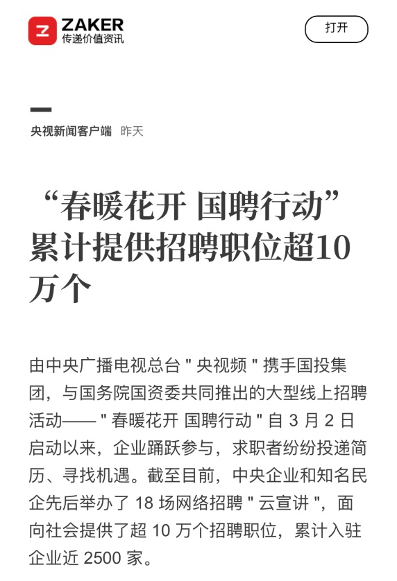 由中央廣播電視總臺“央視頻”攜手國投集團,與國務院國資委共同推出的大型線上招聘活動——“春暖花開 國聘行動”,自3月2日啟動以來,企業踴躍參與,求職者紛紛投遞簡歷。截至3月14日已面向社會提供了超10萬個招聘職位,累計入駐企業近2500家,引發眾多媒體和網站轉載報道。