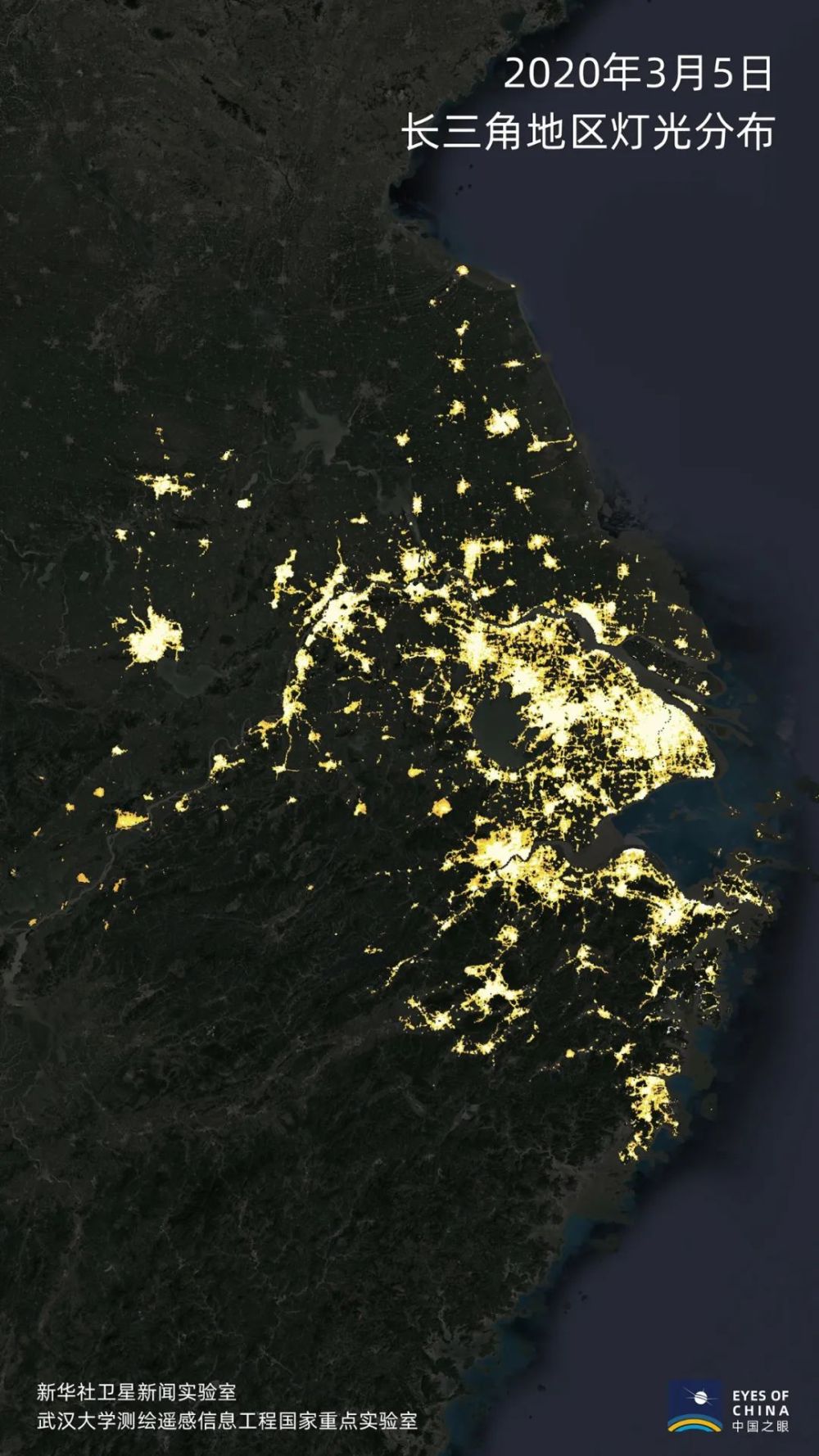 這是長三角地區3月5日較2月初,夜間燈光亮度增加情況,黃色越明亮,亮度增加越多。