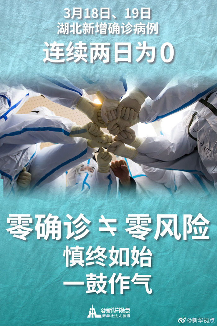 3月18日、19日,湖北連續兩日無新增確診病例,這是一個令人鼓舞的信號。 同時也要清醒看到國內外疫情形勢的復雜性和嚴峻性。零確診不等于零風險,防疫容不得半點松懈。面對出現的新問題、新挑戰,因時因勢精準施策,決不能讓向好形勢發生逆轉。