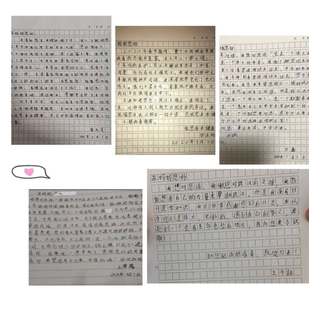 這些孩子們不曾來(lái)到武漢,但是他們的來(lái)信,對(duì)我來(lái)說(shuō)都是一種鼓勵(lì),是我前行的動(dòng)力。其實(shí)在這場(chǎng)戰(zhàn)“疫”中,他們的父母也都和我一樣,在默默地為大家做著自己能做到的一切。他們或許是教師、是警察,或許是公司的普通職員,但他們也都在自己所從事的行業(yè)里、在自己的崗位上堅(jiān)守著。