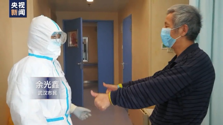 武漢市民 余光鑫:少不了你們的治療,你們的照顧啊。我在等(出院)通知。(多長時間沒出去曬太陽了?)有一個月零四天,沒有出門就在這關住了,所以現在心情不一樣了,心情很不錯,歸心似箭。很好,真的。我覺得現在年輕10歲,因為心情好了,休養半年,我就帶著老伴兒到處玩、走一趟,再去玩遍祖國的大好河山。