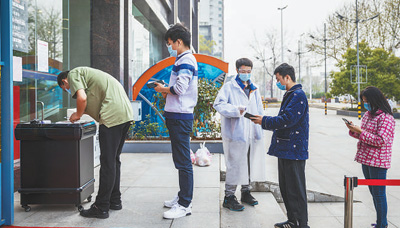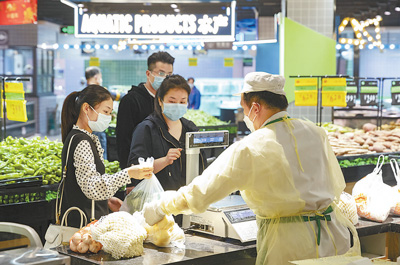 3月22日,在洪山區中百倉儲光谷購物廣場,記者看到超市已經恢復正常營業。為保障顧客健康安全,超市采取了出示綠色健康碼或社區健康證明、測量體溫、每日限流等舉措。據悉,3月20日,武漢市商務局通報,根據武漢市疫情防控指揮部有關工作組決定,自即日起,無疫情小區和社區將有限放行,商業設施和商業網點將逐步有序開放。圖一:顧客正在將蔬菜等商品過秤;圖二:進入超市前,顧客正在排隊登記個人信息并檢測體溫。(記者 張武軍攝)