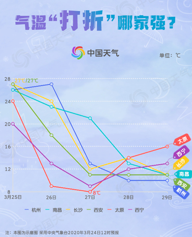 27日,南方大部也將加入降溫的行列,單日降溫幅度沒(méi)有北方劇烈,在6-8℃左右,但是累積降溫幅度大,27日開(kāi)始的兩三天內(nèi),部分地區(qū)也將超過(guò)10℃。城市中,杭州最高氣溫累計(jì)降幅可達(dá)17℃、南昌降16℃、長(zhǎng)沙降15℃、貴陽(yáng)降14℃、上海降13℃,最高氣溫紛紛降至10℃出頭。29日,江淮、江漢和江南大部最低氣溫也僅有4~9℃。
