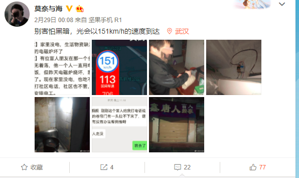 2月28日晚上10點(diǎn)多,樓威辰收到一項(xiàng)特殊的求助。一個(gè)獨(dú)居盲人張磊(化名)因電磁爐燒壞導(dǎo)致跳閘停電,無(wú)法做飯,打電話給社區(qū),社區(qū)說暫時(shí)沒法安排電工,只好通過朋友在網(wǎng)上求助。