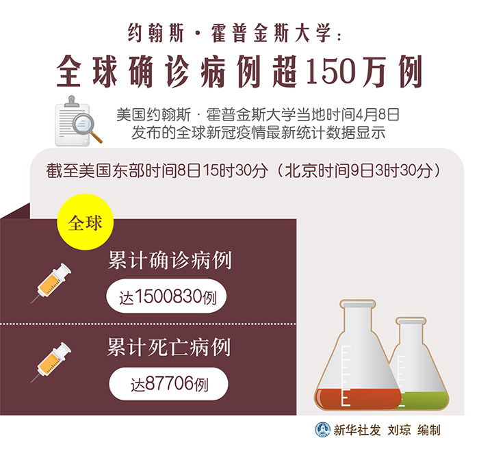 新華社紐約4月8日電? 美國約翰斯·霍普金斯大學(xué)8日發(fā)布的新冠疫情最新統(tǒng)計(jì)數(shù)據(jù)顯示,全球確診病例累計(jì)超過150萬例。