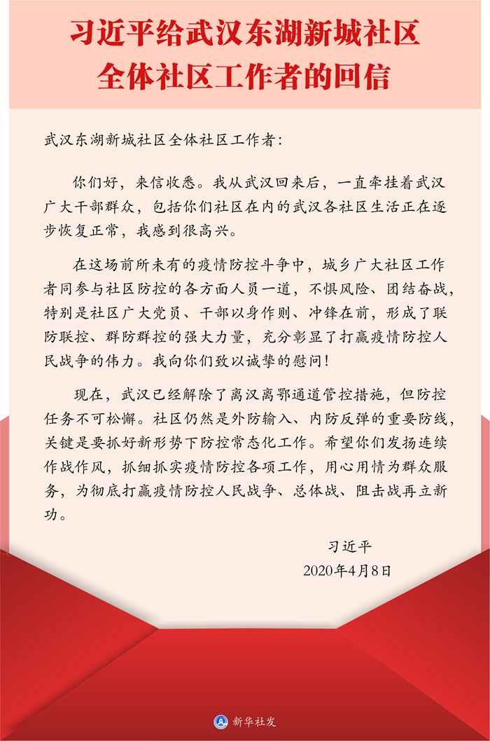 新華社北京4月9日電 中共中央總書記、國家主席、中央軍委主席習近平4月8日給武漢市東湖新城社區全體社區工作者回信,再次肯定城鄉廣大社區工作者在疫情防控斗爭中發揮的重要作用,向他們致以誠摯的慰問,并勉勵他們為徹底打贏疫情防控人民戰爭、總體戰、阻擊戰再立新功。