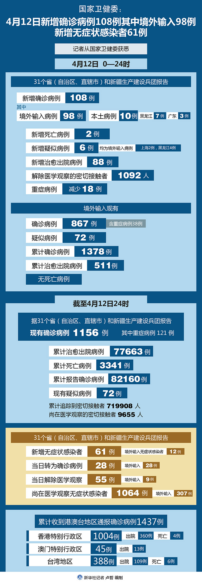 截至4月12日24時,據(jù)31個省(自治區(qū)、直轄市)和新疆生產(chǎn)建設(shè)兵團報告,現(xiàn)有確診病例1156例(其中重癥病例121例),累計治愈出院病例77663例,累計死亡病例3341例,累計報告確診病例82160例,現(xiàn)有疑似病例72例。累計追蹤到密切接觸者719908人,尚在醫(yī)學(xué)觀察的密切接觸者9655人。