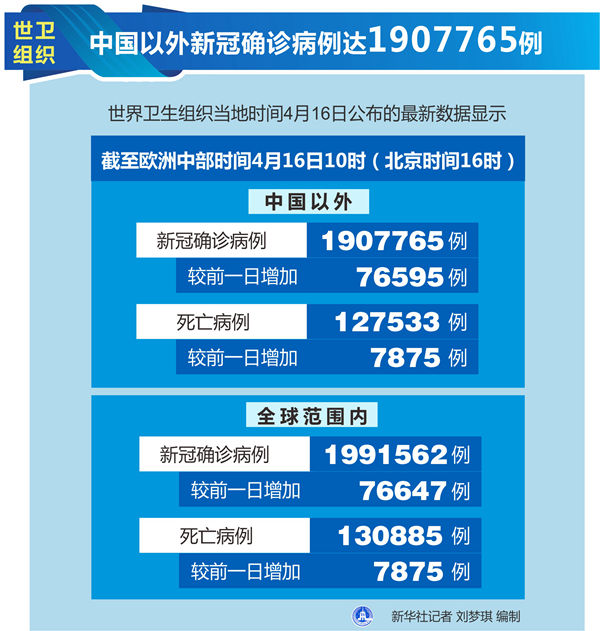 世衛(wèi)組織每日疫情報告顯示,截至歐洲中部時間16日10時(北京時間16時),中國以外新冠確診病例較前一日增加76595例,達(dá)到1907765例;中國以外死亡病例較前一日增加7875例,達(dá)到127533例。