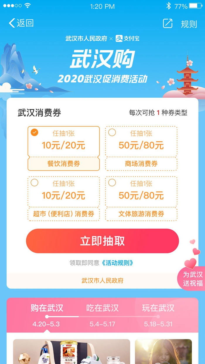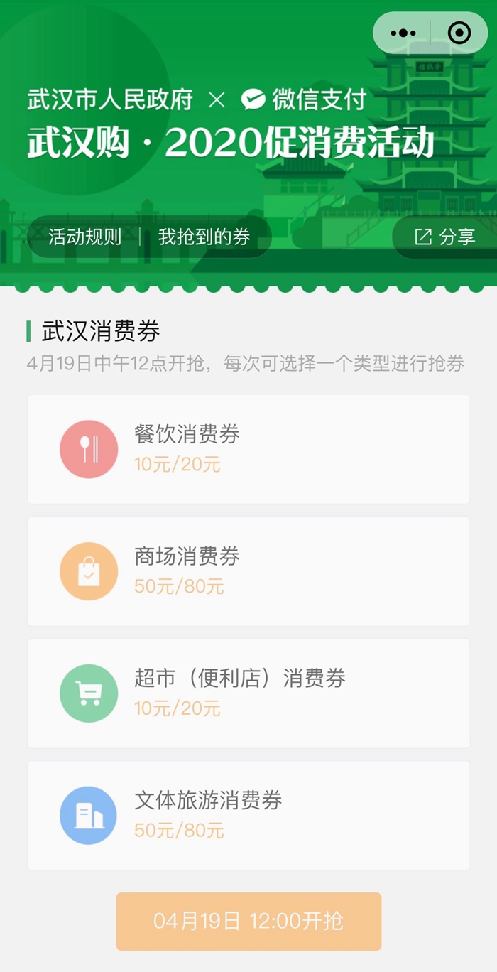 另據了解,為擴大“武漢消費券”惠及力度,阿里巴巴、美團點評、騰訊等3家企業還匹配了總價值約18億元的平臺、機構和商戶消費券,消費者可將“武漢消費券”與平臺、機構和商戶的消費券疊加使用。