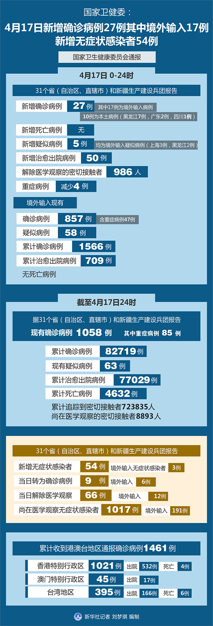 新華社北京4月18日電(記者王希、董瑞豐)國家衛健委18日通報,4月17日0—24時,31個省(自治區、直轄市)和新疆生產建設兵團報告新增確診病例27例,其中17例為境外輸入病例,10例為本土病例(黑龍江7例,廣東2例,四川1例);無新增死亡病例;新增疑似病例5例,均為境外輸入疑似病例(上海3例,黑龍江2例)。
