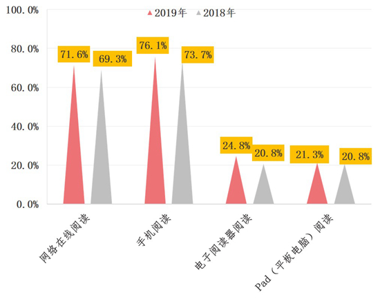 具體來看,2019年有76.1%的成年國民進行過手機閱讀,71.6%的成年國民進行過網絡在線閱讀,24.8%的成年國民在電子閱讀器上閱讀,21.3%的成年國民使用Pad(平板電腦)進行數字化閱讀,均較2018年有所上升。