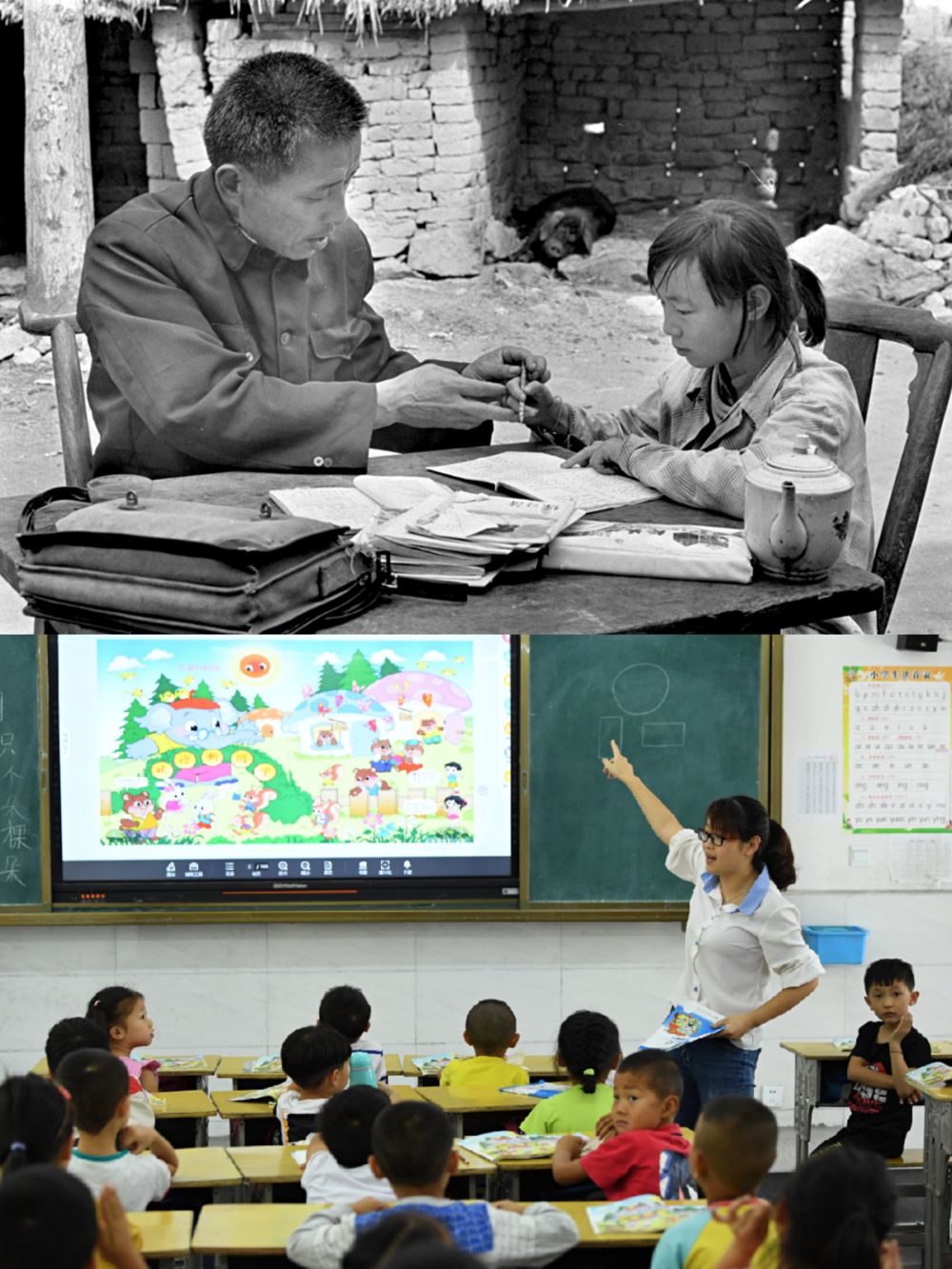 ?。ㄉ蠄D:1991年5月,金寨縣希望小學老師胡遵訓跑20多里山路為學生胡亞麗補課,新華社記者張曙光攝;下圖:2019年9月3日,金寨縣希望小學南校區學生通過多媒體上課。新華社記者劉軍喜攝)