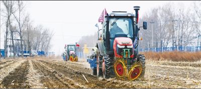 今年備春耕,吉林省農安縣哈拉海鎮創業村農民楊守奎帶領合作社五十來戶農民,開著拖拉機,拖掛上埋管機器,把兩指多寬的黑色滴灌膠管埋進壟里。