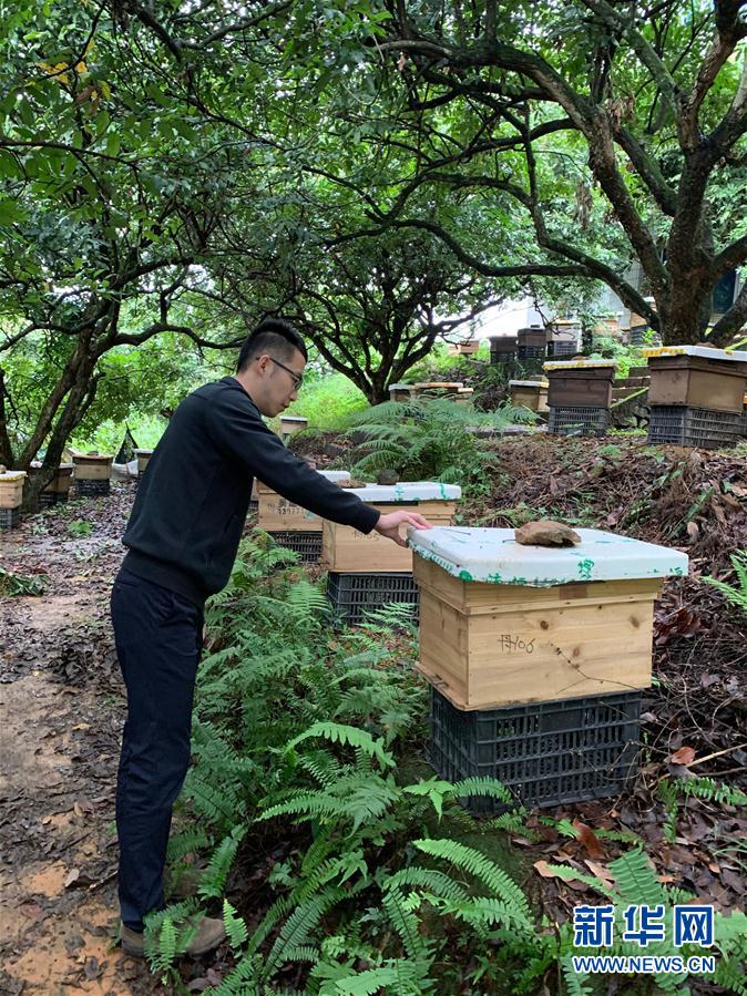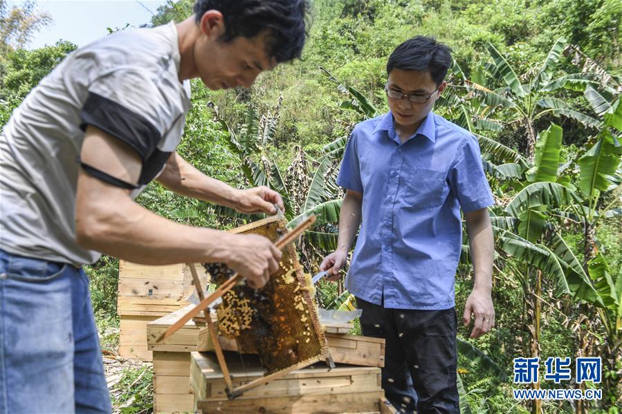廣西大化瑤族自治縣古河鄉丹桂村駐村第一書記馬騰在查看蜜蜂養殖情況(4月22日攝)。 新華社記者 何偉 攝