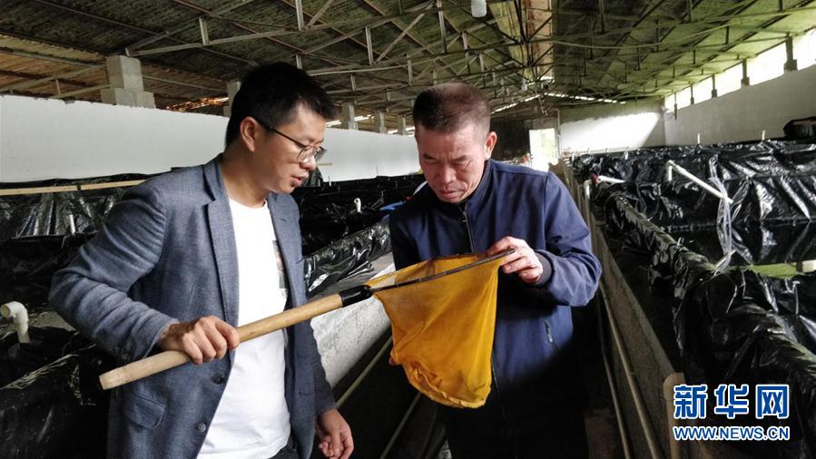 廣西上林縣西燕鎮岜獨村駐村第一書記康勇(左一)在龜鱉養殖場和養殖能人交流(4月24日攝)。 新華社記者 農冠斌 攝