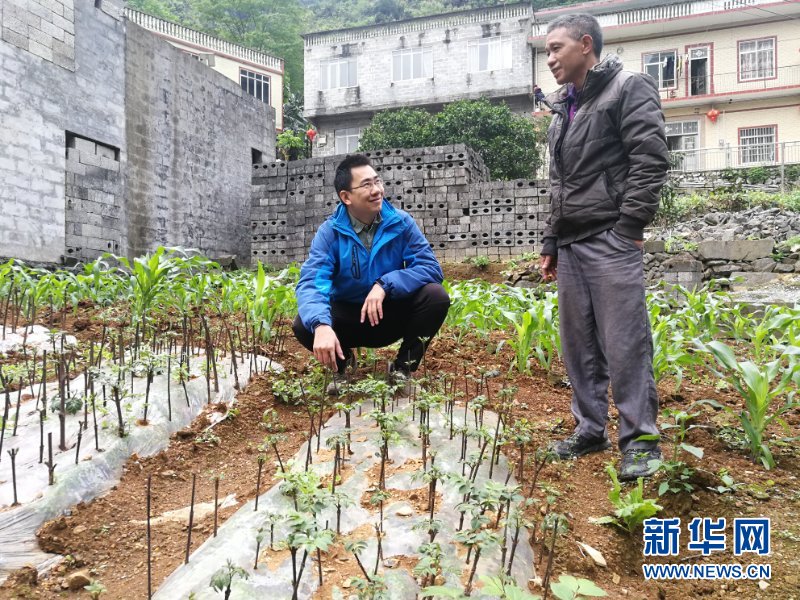 廣西都安瑤族自治縣保安鄉元力村駐村第一書記沈彥東(左)在建檔立卡貧困戶周振東的田地里跟他一起謀劃產業發展(4月24日攝)。 新華社記者 何偉 攝