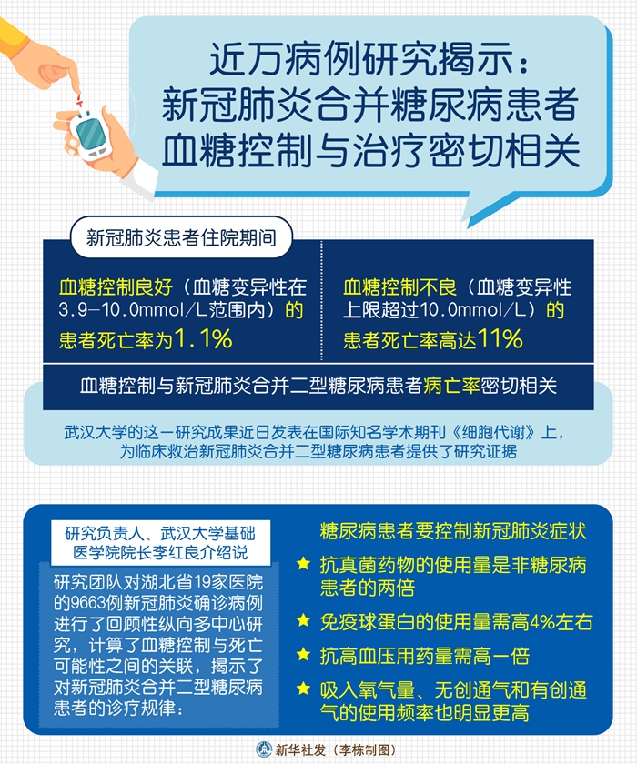 新華社武漢5月4日電(記者 王賢)新冠肺炎患者住院期間,血糖控制良好(血糖變異性在3.9-10.0mmol/L范圍內(nèi))的患者死亡率為1.1%,血糖控制不良(血糖變異性上限超過10.0mmol/L)的患者死亡率高達(dá)11%,血糖控制與新冠肺炎合并二型糖尿病患者病亡率密切相關(guān)。武漢大學(xué)的這一研究成果近日發(fā)表在國際知名學(xué)術(shù)期刊《細(xì)胞代謝》上,為臨床救治新冠肺炎合并二型糖尿病患者提供了研究證據(jù)。