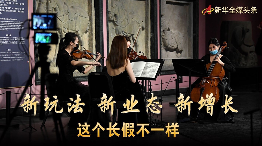 5月2日晚,通過網(wǎng)絡(luò)直播的“云上國(guó)寶”音樂會(huì)在西安碑林博物館奏響。這是4月28日,西安交響樂團(tuán)“弦上莫奈四重奏”為音樂會(huì)彩排。 新華社記者 李一博 攝