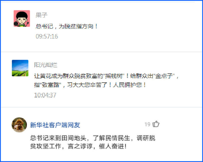 消息播發(fā)后,引起網(wǎng)民熱烈反響。大家紛紛為總書記關心脫貧攻堅、親自指導產(chǎn)業(yè)扶貧叫好,為總書記心系群眾、深入一線點贊。