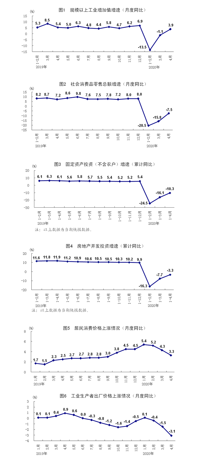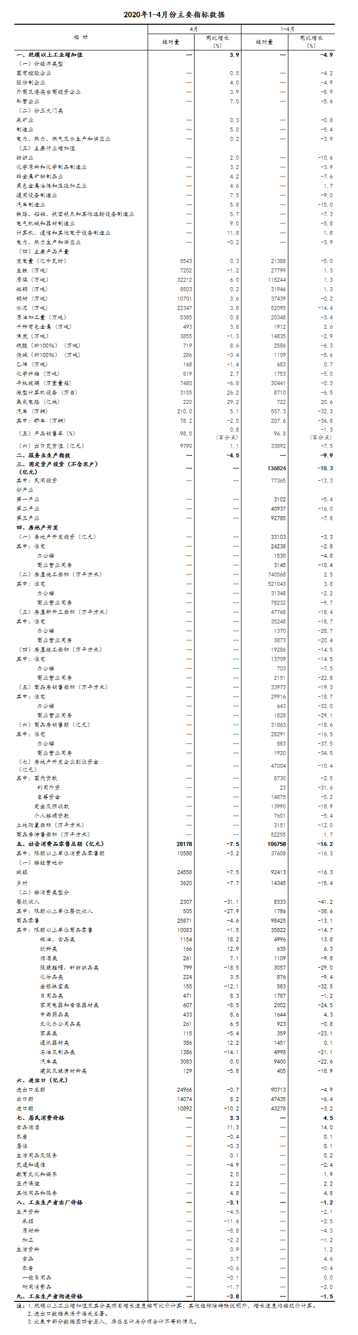 4月份,全國規(guī)模以上工業(yè)增加值同比增長3.9%,3月份為下降1.1%;環(huán)比增長2.27%。1-4月份,全國規(guī)模以上工業(yè)增加值同比下降4.9%,降幅比1-3月份收窄3.5個百分點。4月份,分經(jīng)濟類型看,國有控股企業(yè)增加值增長0.5%;股份制企業(yè)增長4.0%,外商及港澳臺商投資企業(yè)增長3.9%;私營企業(yè)增長7.0%。分三大門類看,采礦業(yè)增加值增長0.3%;制造業(yè)增長5.0%,3月份為下降1.8%;電力、熱力、燃氣及水生產(chǎn)和供應業(yè)增長0.2%。高技術(shù)制造業(yè)和裝備制造業(yè)增長較快。4月份,高技術(shù)制造業(yè)和裝備制造業(yè)增加值分別增長10.5%和9.3%,快于規(guī)模以上工業(yè)6.6和5.4個百分點。從產(chǎn)品產(chǎn)量看,光纜,挖掘、鏟土運輸機械,集成電路,工業(yè)機器人,微型計算機設備產(chǎn)量同比分別增長43.8%、40.8%、29.2%、26.6%、26.2%。
