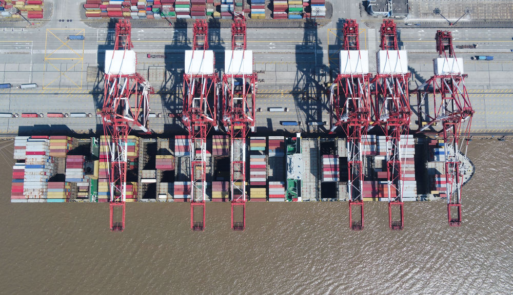 這是3月18日拍攝的上海洋山港集裝箱碼頭(無人機照片)。新華社記者 丁汀 攝