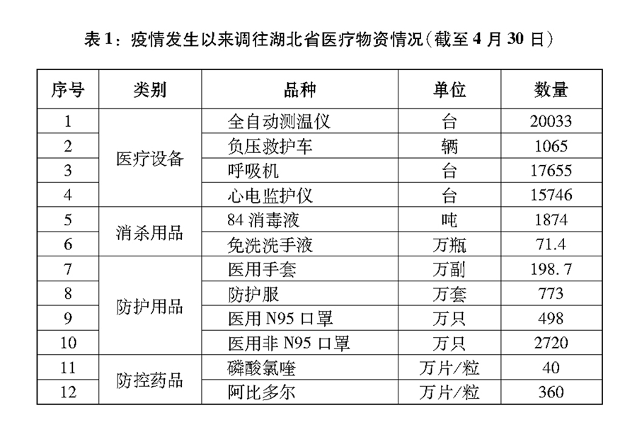 開展新中國成立以來規模最大的醫療支援行動。調動全國醫療資源和力量,全力支持湖北省和武漢市醫療救治。自1月24日除夕至3月8日,全國共調集346支國家醫療隊、4.26萬名醫務人員、900多名公共衛生人員馳援湖北。19個省份以對口支援、以省包市的方式支援湖北省除武漢市以外16個地市,各省在發生疫情、防控救治任務十分繁重的情況下,集中優質醫療資源支援湖北省和武漢市。人民解放軍派出4000多名醫務人員支援湖北,承擔火神山醫院等3家醫療機構的醫療救治任務,空軍出動運輸機緊急運送醫療物資。各醫療隊從接受指令到組建2小時內完成,24小時內抵達,并自帶7天防護物資,抵達后迅速開展救治。在全國緊急調配全自動測溫儀、負壓救護車、呼吸機、心電監護儀等重點醫療物資支援湖北省和武漢市(表1)。從全國調集4萬名建設者和幾千臺機械設備,僅用10天建成有1000張病床的火神山醫院,僅用12天建成有1600張病床的雷神山醫院。短短10多天建成16座方艙醫院,共有1.4萬余張床位。加強臨床血液供應,10個省份無償支援湖北省紅細胞4.5萬單位,血小板1762個治療量,新鮮冰凍血漿137萬毫升(不含恢復期血漿)。大規模、強有力的醫療支援行動,有力保障了湖北省和武漢市救治,極大緩解了重災區醫療資源嚴重不足的壓力。