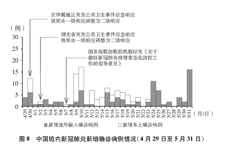 境內疫情總體呈零星散發狀態,局部地區出現散發病例引起的聚集性疫情,境外輸入病例基本得到控制,疫情積極向好態勢持續鞏固,全國疫情防控進入常態化。加大力度推進復工復產復學,常態化防控措施經受“五一”假期考驗。經中共中央批準,國務院聯防聯控機制派出聯絡組,繼續加強湖北省疫情防控。(圖8)