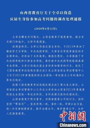 經(jīng)調(diào)查核實,仝卓以偽造應(yīng)屆生身份,于2013年參加解放軍藝術(shù)學(xué)院、中央戲劇學(xué)院、天津音樂學(xué)院等高校的專業(yè)課考試,并參加當(dāng)年高考,被中央戲劇學(xué)院歌劇表演專業(yè)錄取。依據(jù)《國家教育考試違規(guī)處理辦法》第九條之規(guī)定,山西省招生考試管理中心作出仝卓參加山西省2013年普通高校招生全國統(tǒng)一考試各階段、各科成績無效的處理決定。