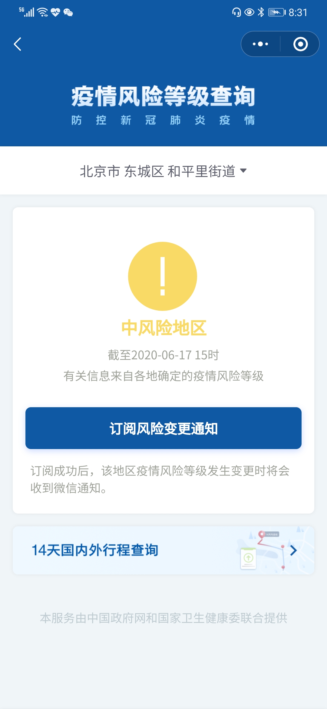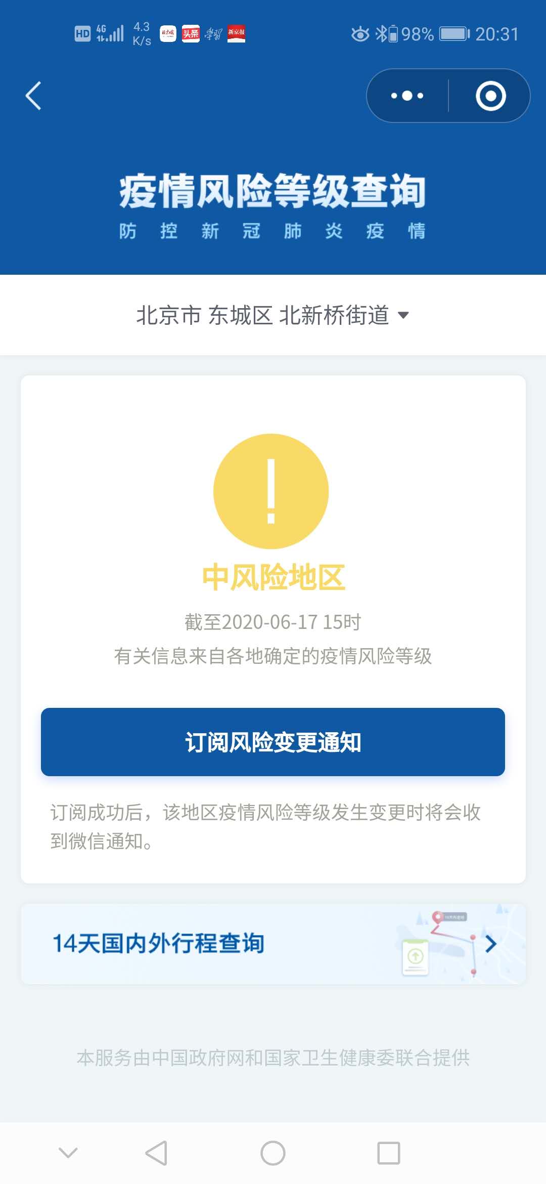記者從國務院客戶端疫情風險查詢小程序上了解到,截至6月17日15時,北京市又有5個街道升級為中風險地區,分別為東城區和平里街道、北新橋街道,豐臺區長辛店街道,大興區青云店鎮,西城區白紙坊街道。目前,本市已經有32個街鄉鎮升級為中風險地區,另有豐臺花鄉地區為高風險地區,涉及豐臺區、大興區、海淀區、西城區、房山區、東城區、石景山區、朝陽區、門頭溝區9個區。