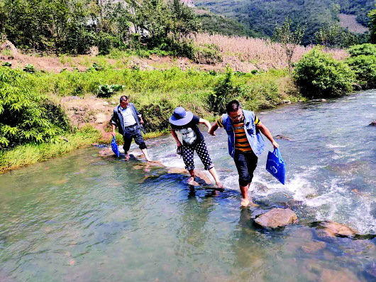納雍縣鍋圈巖鄉土補村扶貧特崗張龍(右)與張迪(中)等蹚水過河走訪貧困戶。組圖均由受訪者提供(手機拍攝)