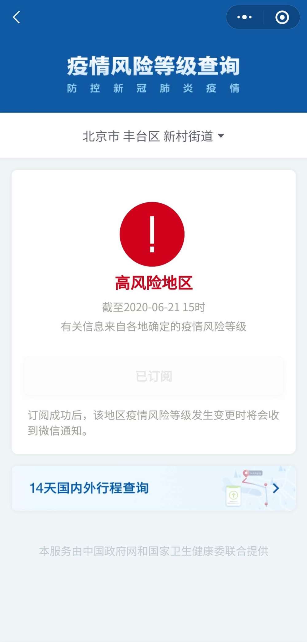 記者從國務院客戶端小程序“疫情風險等級查詢”上了解到,截至6月21日15時,北京市豐臺區新村街道、大興區黃村(地區)鎮由中風險調整為高風險。北京市豐臺區長辛店街道、右安門街道,大興區安定鎮,海淀區八里莊街道,通州區北苑街道由低風險調整為中風險。