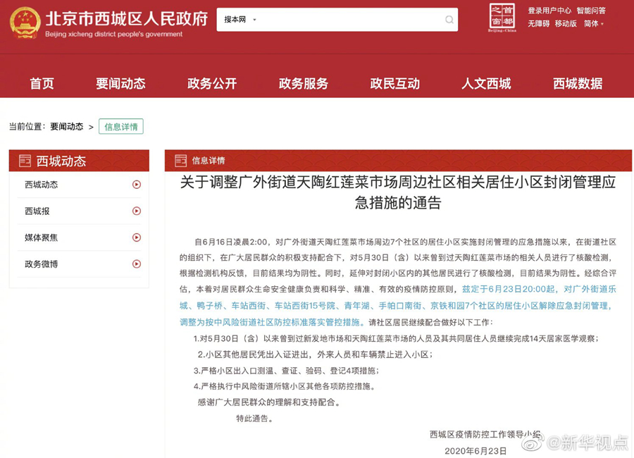 北京西城天陶紅蓮菜市場周邊7社區解除應急封閉管理-新華網