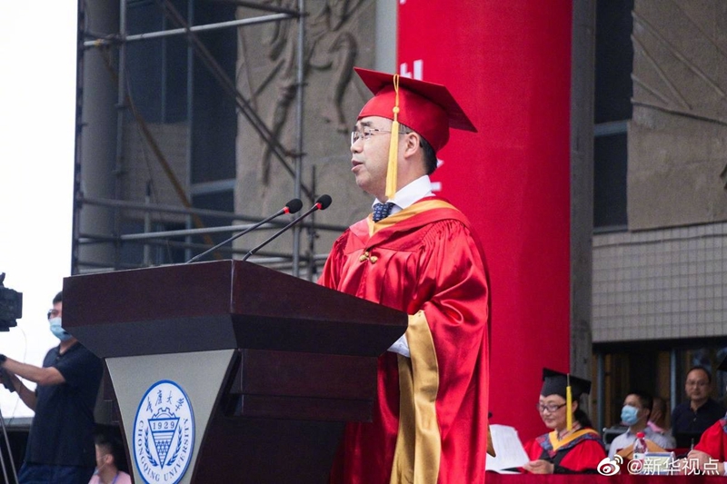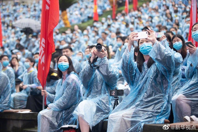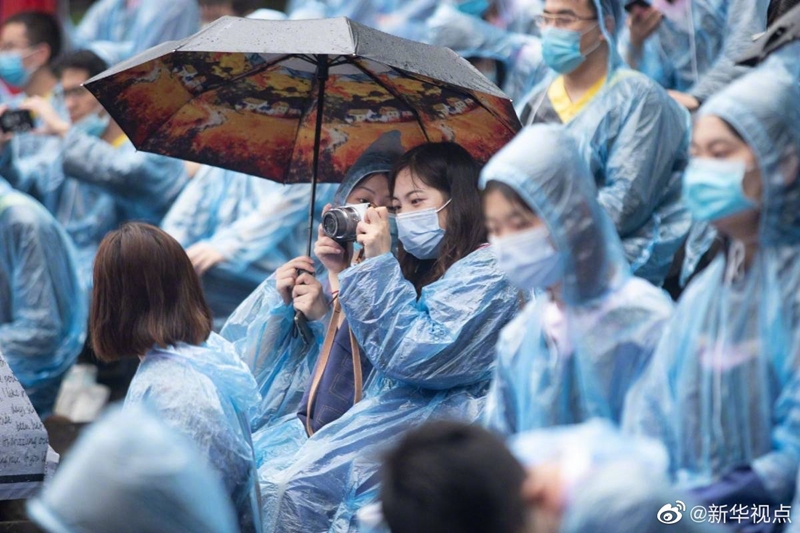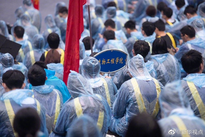 6月28日上午,重慶大學在風雨操場舉行2020屆學生畢業典禮上,因為現場突然下起了大雨,校長張宗益在致辭時只念了標題,向畢業生送上深情祝福,還打趣說“好雨知時節”。參加畢業典禮的2000余名畢業生代表穿著雨衣,完成了這場簡短的畢業典禮。(記者柯高陽)?