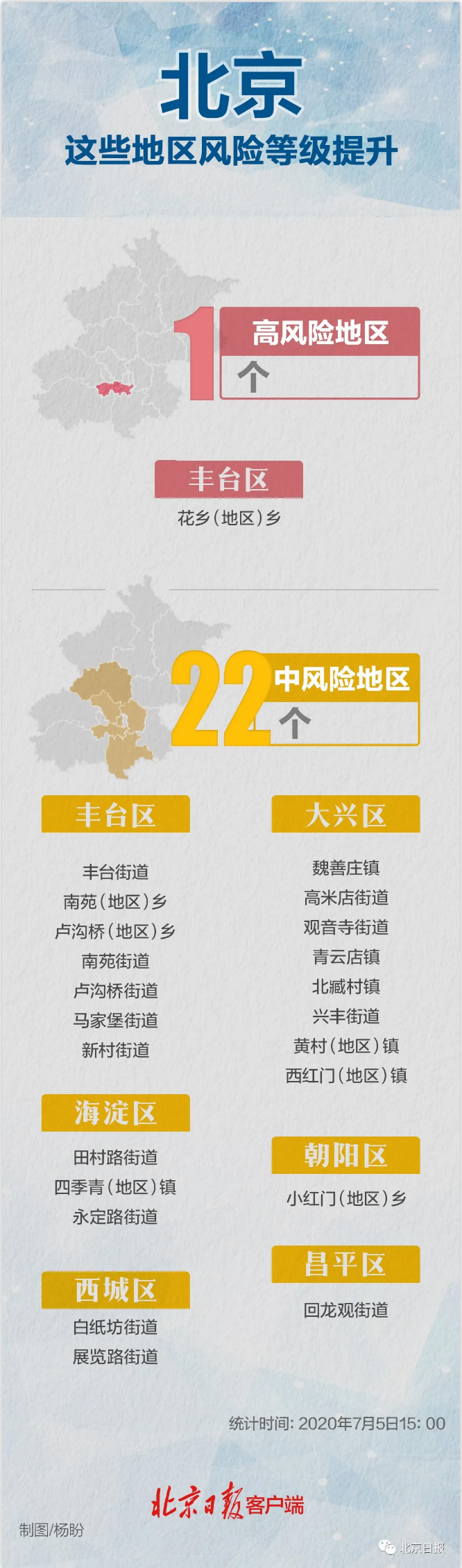 截至目前,本市有22個中風險地區,涉及豐臺區、大興區、海淀區、西城區、朝陽區、昌平區6個區;另有1個高風險地區,是豐臺區花鄉(地區)鄉。