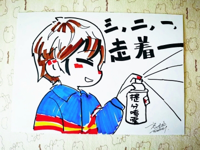 三年前,剛?cè)敫咭唬瑥堃噍嫠诘陌嗉?jí)與當(dāng)時(shí)的高三年級(jí)安排在了同一樓層。“雖然沒(méi)有太多交集,但是每天進(jìn)進(jìn)出出,高三學(xué)長(zhǎng)們的辛苦、努力和疲憊,我們都看在眼里。”張亦萱特別想做點(diǎn)兒什么。高考前,學(xué)校在布置考場(chǎng)時(shí),張亦萱找到班主任,問(wèn)能不能給高三每個(gè)班畫(huà)一幅畫(huà),貼在門(mén)上當(dāng)加油海報(bào)。老師同意了。張亦萱不僅畫(huà)了漫畫(huà),還邀請(qǐng)班上字跡漂亮的同學(xué)寫(xiě)上寄語(yǔ)。